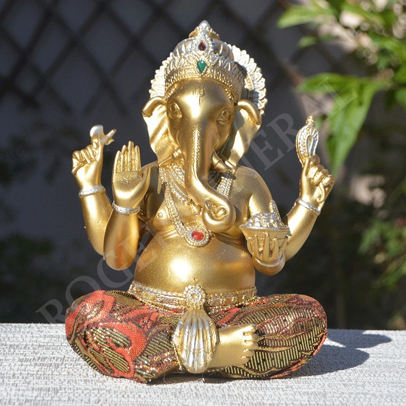 Très belle statue de Ganesh, en résine, couleur or et vêtu de tissus brodés de belle qualité