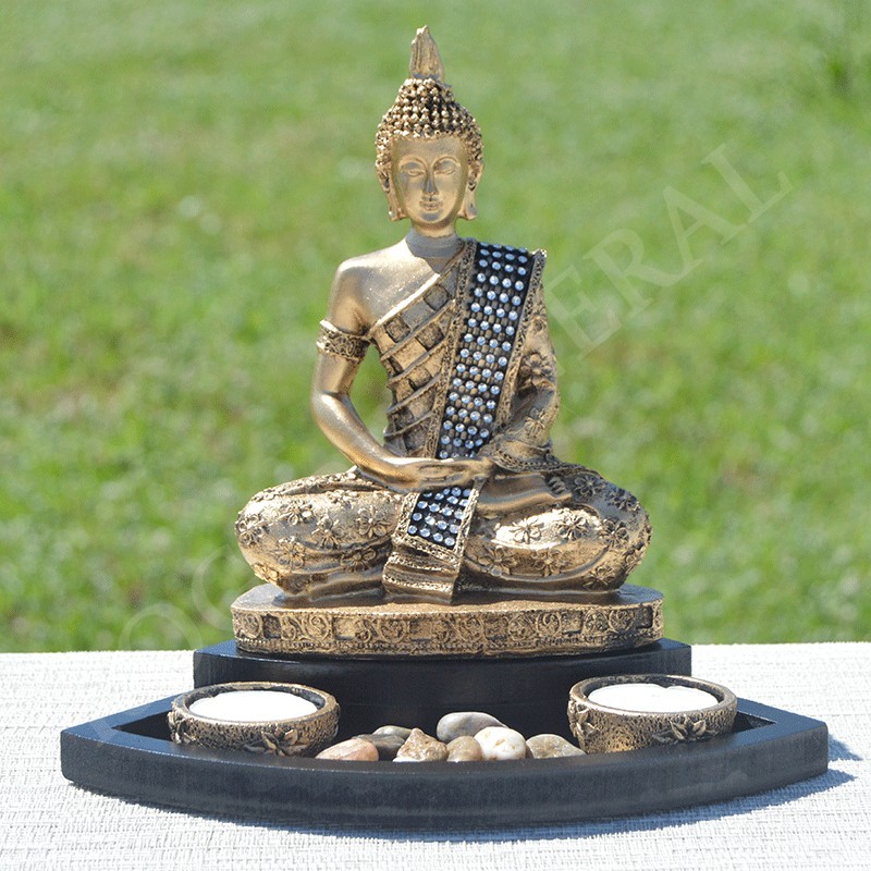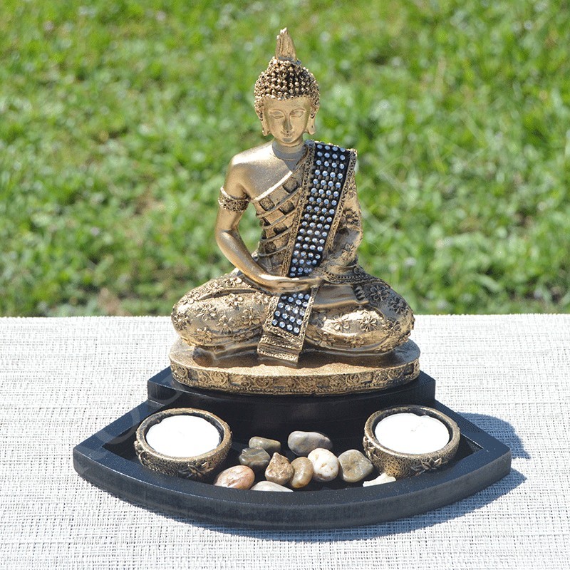 Bouddha moulé dans la résine, de très belle qualité avec deux portes bougies et quelques pierres de décorations.