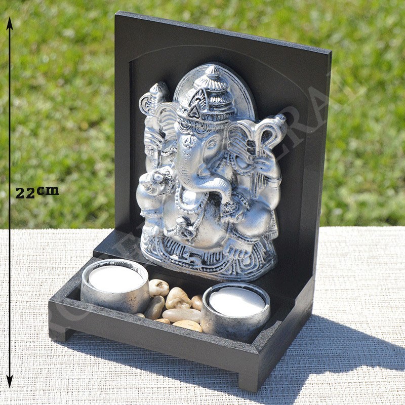 Ganesh de décoration, moulé dans la résine, très léger, couleur argent, avec deux portes bougies