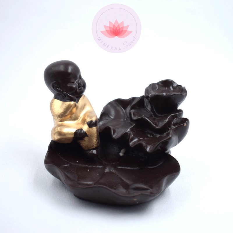 Fontaine en résine avec figure de petit Bouddha doré pour bruler encens en cone.