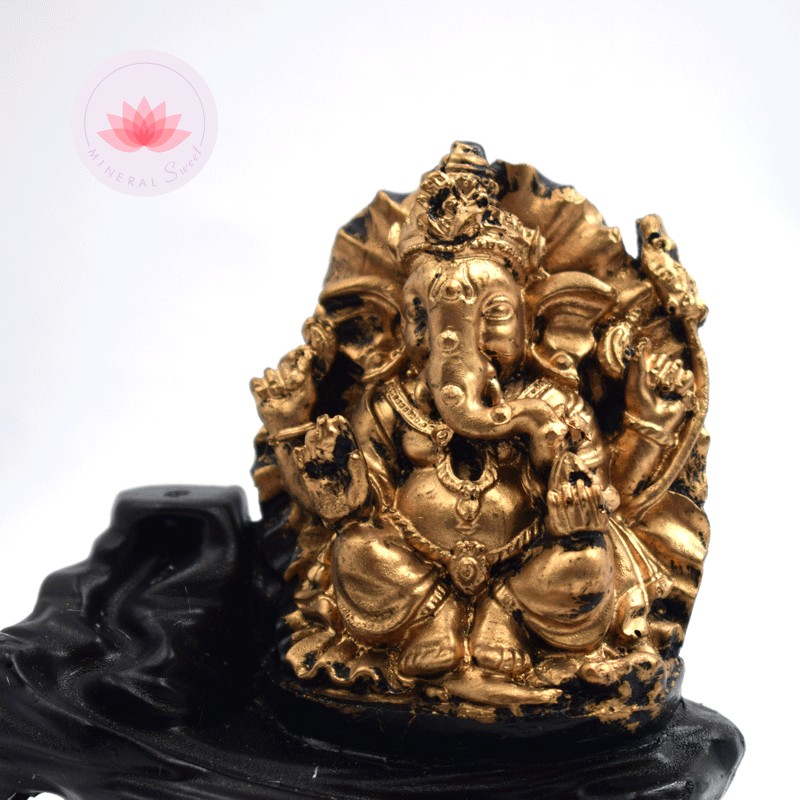 Fontaine en résine avec figure de Ganesh doré en tron pour bruler des cones d'encens.