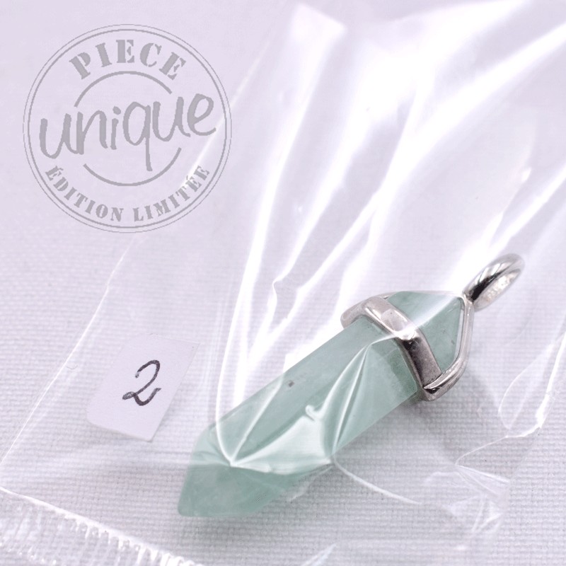 Pendentif Fluorite verte biterminé serti métal blanc.
