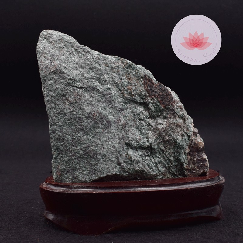 Fuchsite brute de très belle qualité sur socle de bois vernis.