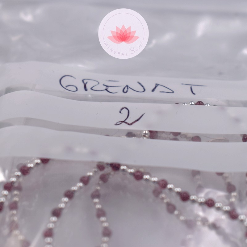 Grenat désigne une famille de minéraux du groupe des nésosilicates cristallisant dans le système cristallin cubique (ou isométrique). Les grenats de qualité gemme sont des pierres fines. Employé seul, le terme grenat est quasi synonyme de pyrope-almandin. Sa composition chimique est : le Pyrope rouge : Mg3Al2(SiO4)3 et l’Almandin rouge-violet : Fe3Al2(SiO4)3. Dans la famille du Grenat le grenat les couleurs vont du rose au brun en passant par le rouge, si la couleur provient principalement de l’almandin, et davantage vers le rouge orange, si le pôle limite dominant est le spessartine.