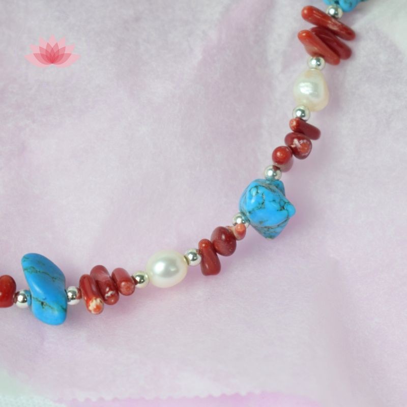 Joli collier en Corail teinté et Howlite teintée agrémenté de perles d'eau douce.