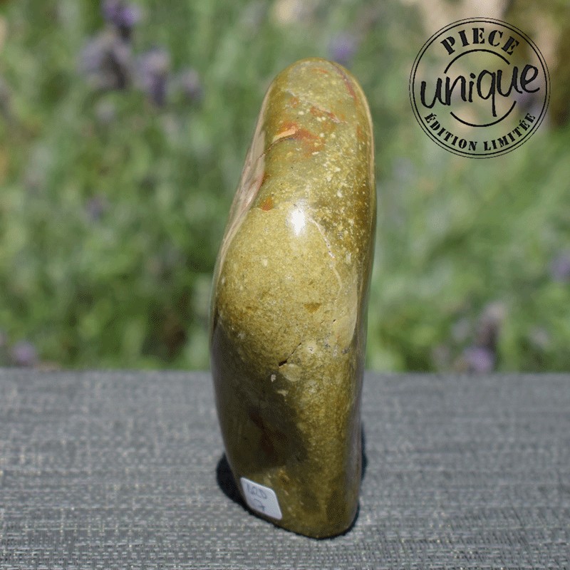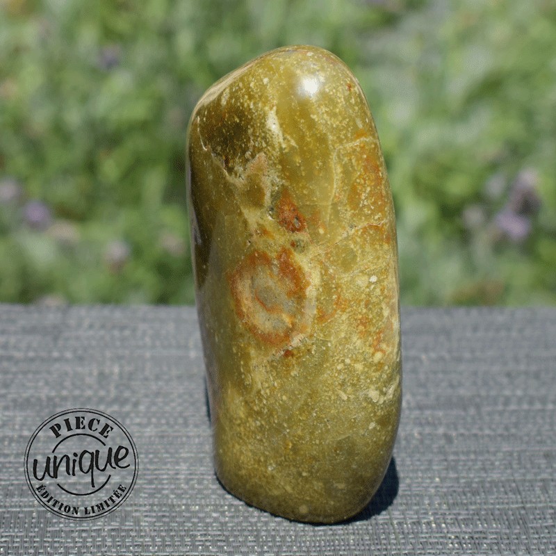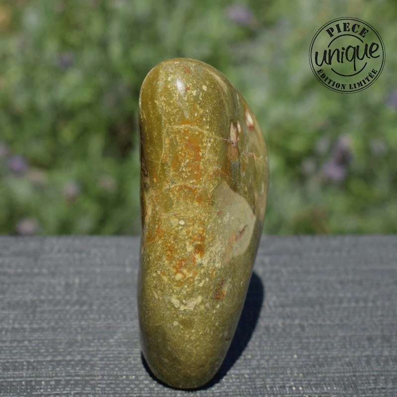 Pierre d'équilibre par excellence, le jaspe favorise les qualités de la personne, ce jaspe de par sa couleur est relié au chakra 4, le cœur, ses dessins donne l'impulsion du mouvement, d'une plus grande ouverture d'esprit, il confère le désir de nouvelles expériences, c'est une pierre qui ouvre à la gaieté, à la bonne humeur…
