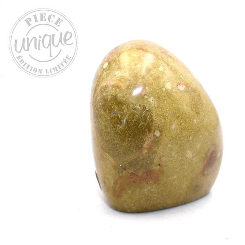 Pierre d'équilibre par excellence, le jaspe favorise les qualités de la personne, ce jaspe de par sa couleur est relié au chakra 4, le cœur, ses dessins donne l'impulsion du mouvement, d'une plus grande ouverture d'esprit, il confère le désir de nouvelles expériences, c'est une pierre qui ouvre à la gaieté, à la bonne humeur…