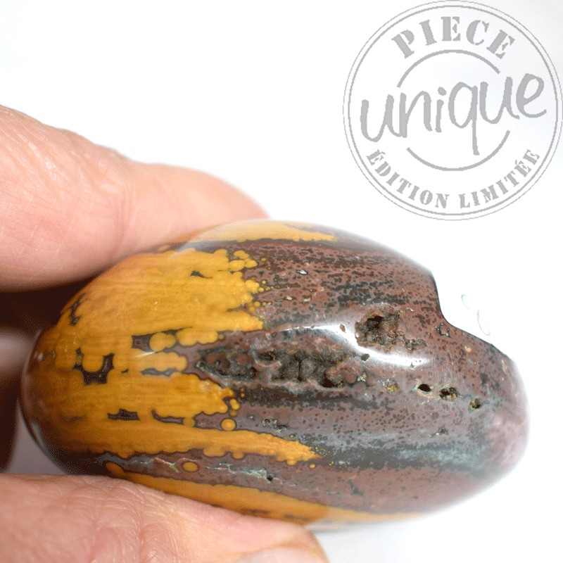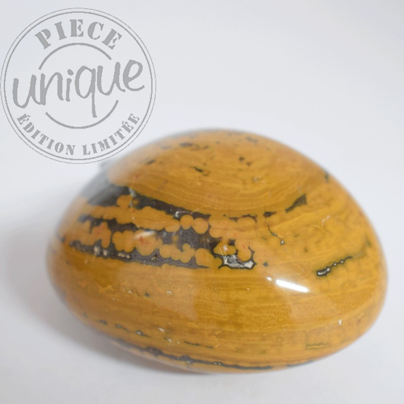 Ce jaspe en particulier offre de par ces dessins la symbolique du mouvement. de par sa couleur il est relié aux chakras principalement 3 et 4 (plexus solaire, cœur...)