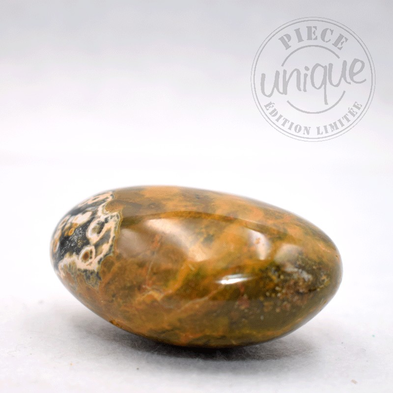 Ce jaspe en particulier offre de par ces dessins la symbolique du mouvement. de par sa couleur il est relié aux chakras principalement 3 et 4 (plexus solaire, cœur...)