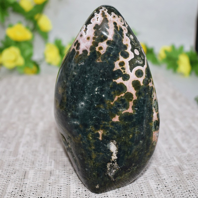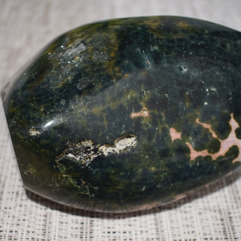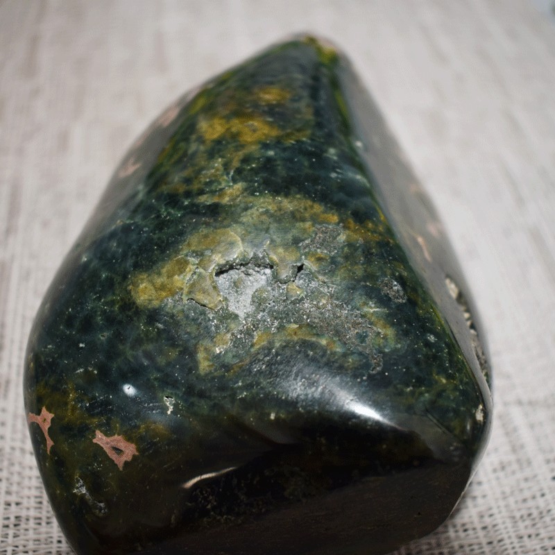 Ce jaspe en particulier offre de par ces dessins la symbolique du mouvement. de par sa couleur il est relié aux chakras principalement 3 et 4 (plexus solaire, cœur...)