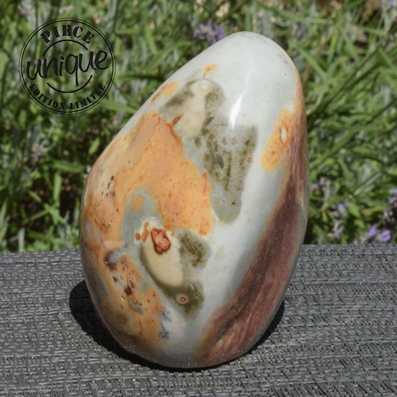 Le nom de ces Jaspe polychrome vient de ses différentes couleurs sur une même pierre, elle offre des dessins où l'imagination peut s'exprimer pleinement.