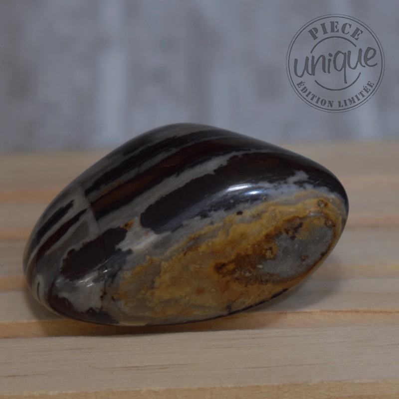 Pierre d'équilibre par excellence, comme tous les jaspes de cette grande famille, ce jaspe offre une ouverture d'esprit, fécondes les idées, la créativité, son aspect invite au voyage intérieur, à aller à la découverte des ses propres capacités d'invention, de réalisation.
