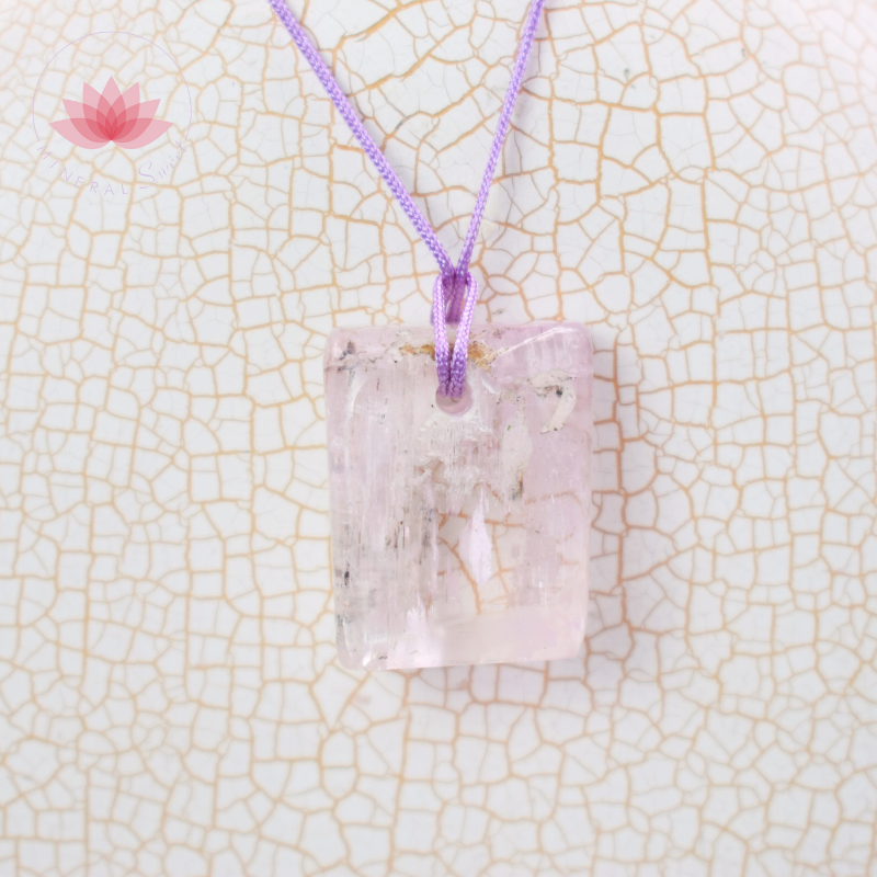 Kunzite polie toute face en pendentif. Avec un cordon en couleur mauve.