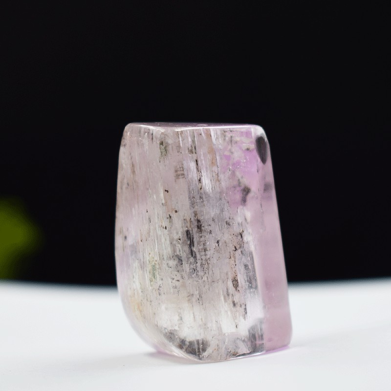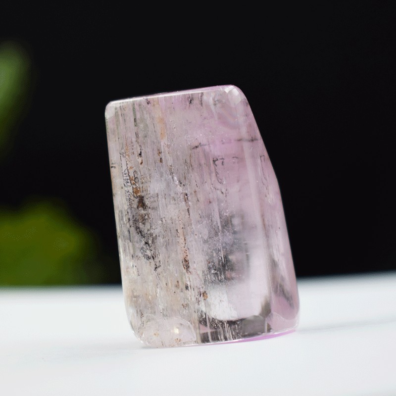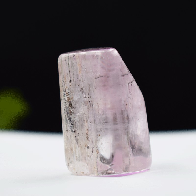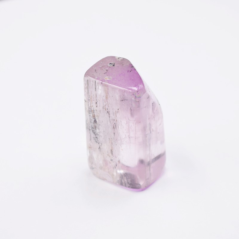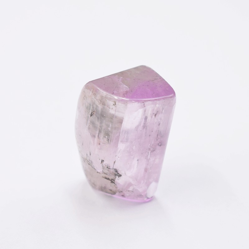 La Kunzite dest une variété rare de Spodumène qui est un minéral de la classe des silicates (sous-classe des inosilicates, famille des pyroxènes). De composition idéale LiAlSi2O6, il comporte généralement des traces de Fe, Mn, Mg, Ca, Na, K et H2O. De nombreuses couleurs: incolore; blanc; gris; jaunâtre; verdâtre; vert; jaune; rose; violet clair; blanc grisâtre; lilas