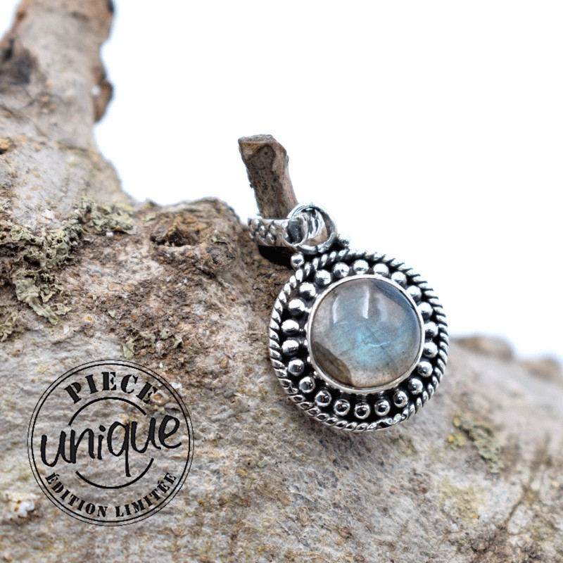Très joli pendentif de labradorite, de première qualité,serti argent 925, forme ronde.