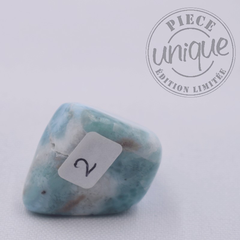Le Larimar est une variété de pectolite de couleur bleue qui se trouve en République dominicaine. Sa coloration varie du blanc au bleu foncé en passant par différentes teintes de bleu. Composition chimique: Ca2Na[Si3O8OH]. Sa couleur est bleue tachetée de blanc comme des nuages sur un ciel bleu.