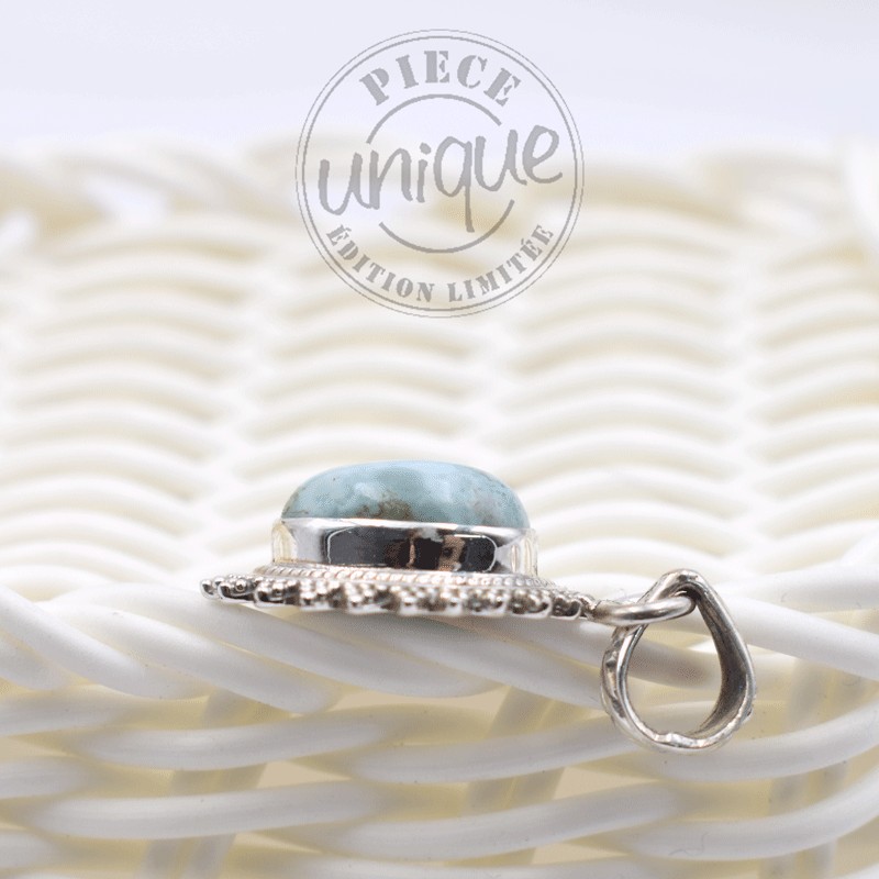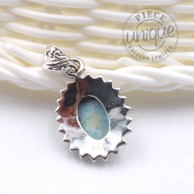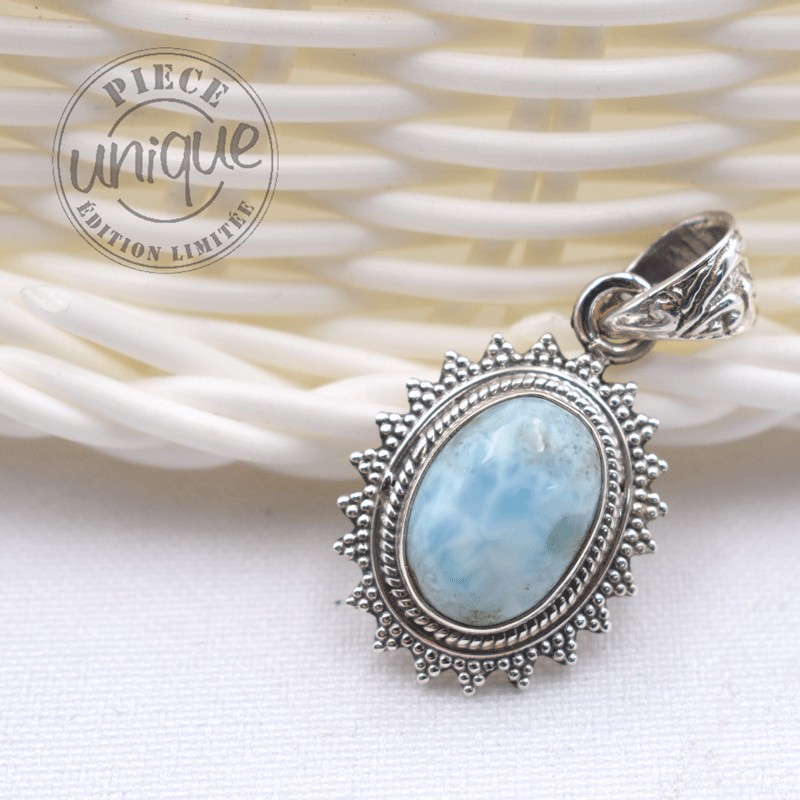 Le Larimar est une variété de pectolite de couleur bleue qui se trouve en République dominicaine. Sa coloration varie du blanc au bleu foncé en passant par différentes teintes de bleu. Composition chimique: Ca2Na[Si3O8OH]. Sa couleur est bleue tachetée de blanc comme des nuages sur un ciel bleu.