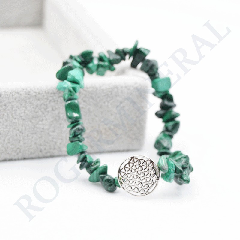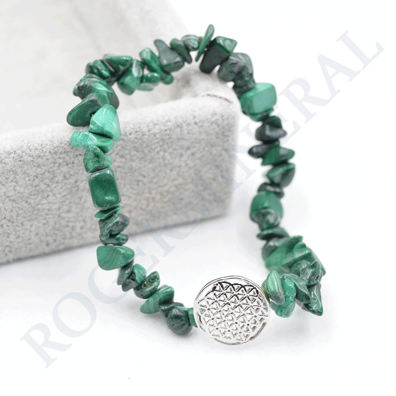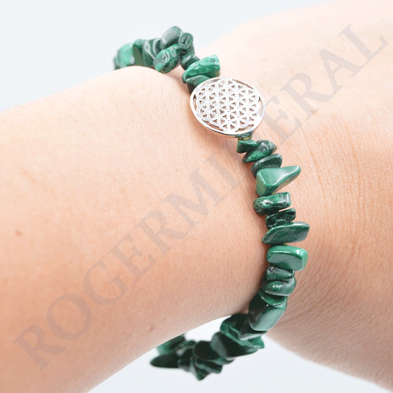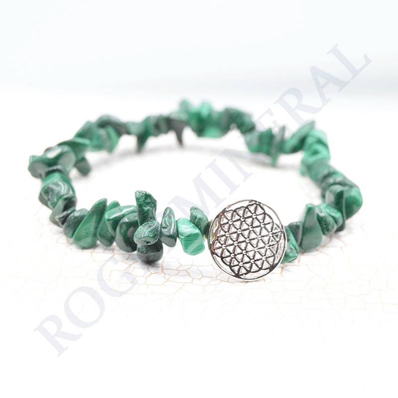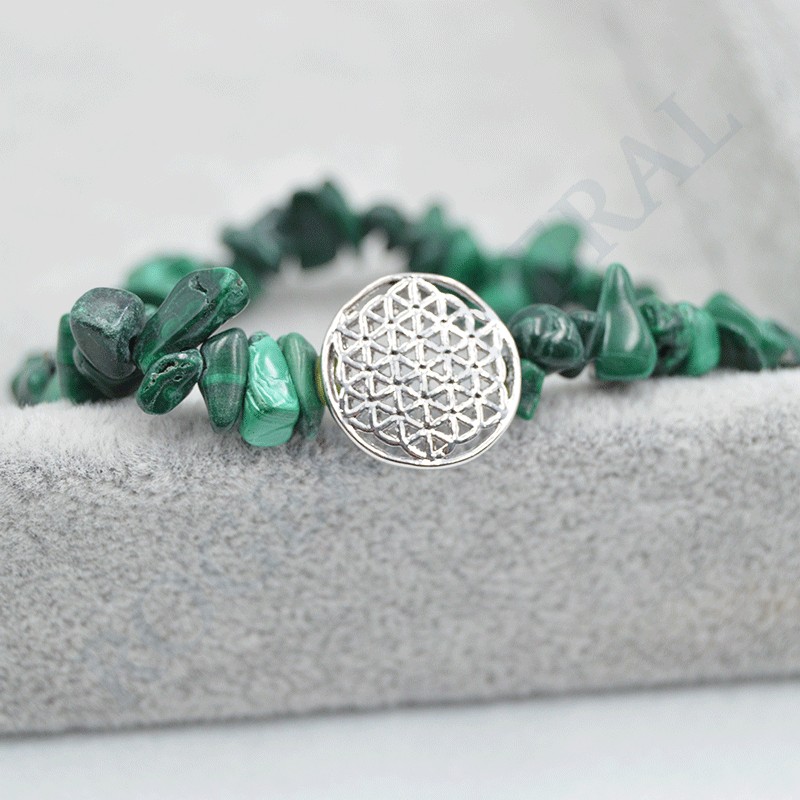 Bracelet de Malachite, petites perles "chips" ou autrement appelées "baroques" agrémenté d'une perle Fleur de Vie en métal blanc