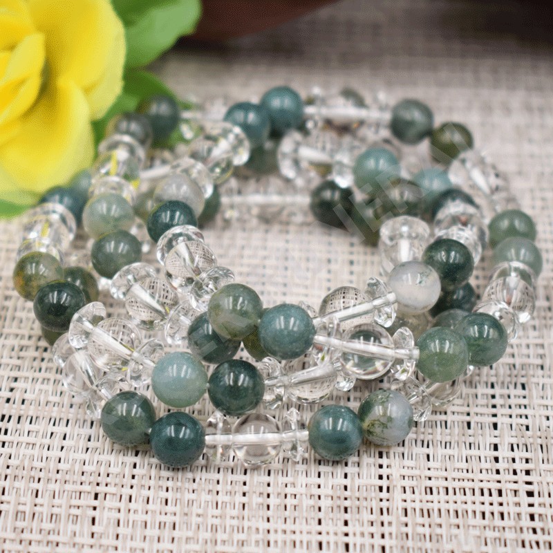 Bracelet Agate mousse et cristal de roche, perles rondes et perles plattes.