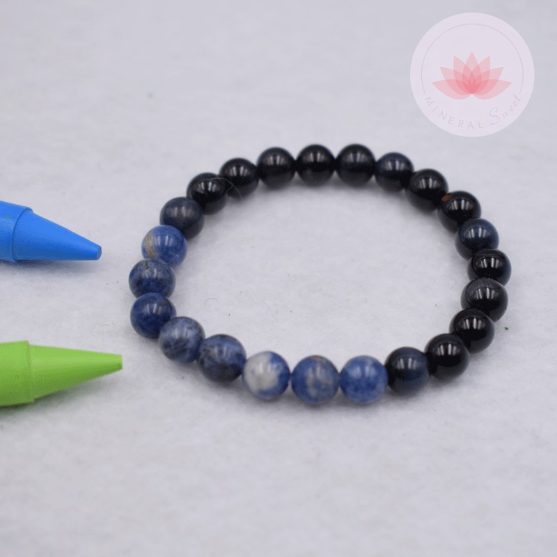Ce bracelet est composé de 2 pierres : la sodalite, l’œil de faucon.