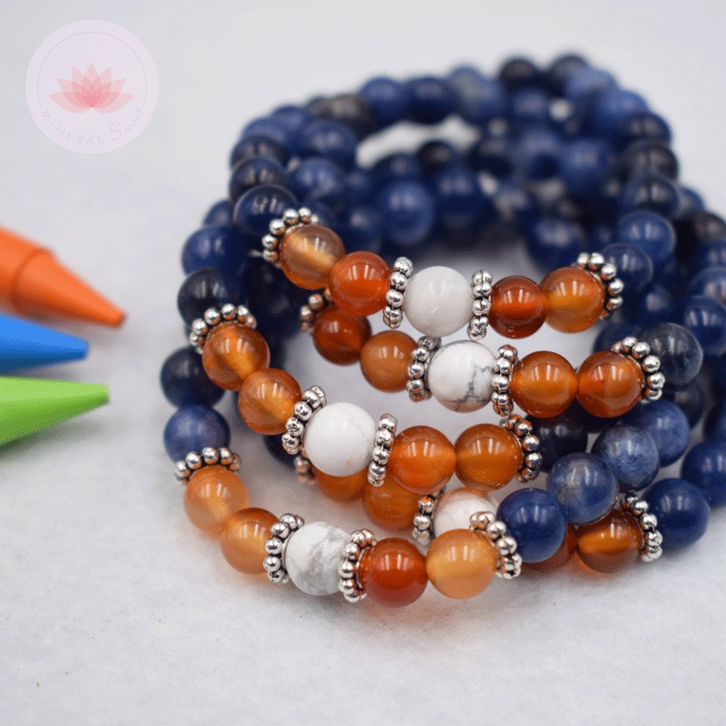 Ce bracelet est composé de 3 pierres : la cornaline, la howlite, la sodalite.