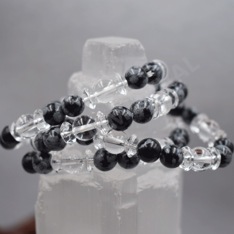 Élégant bracelet en Cristal de roche et Obsidienne flocon de neige.