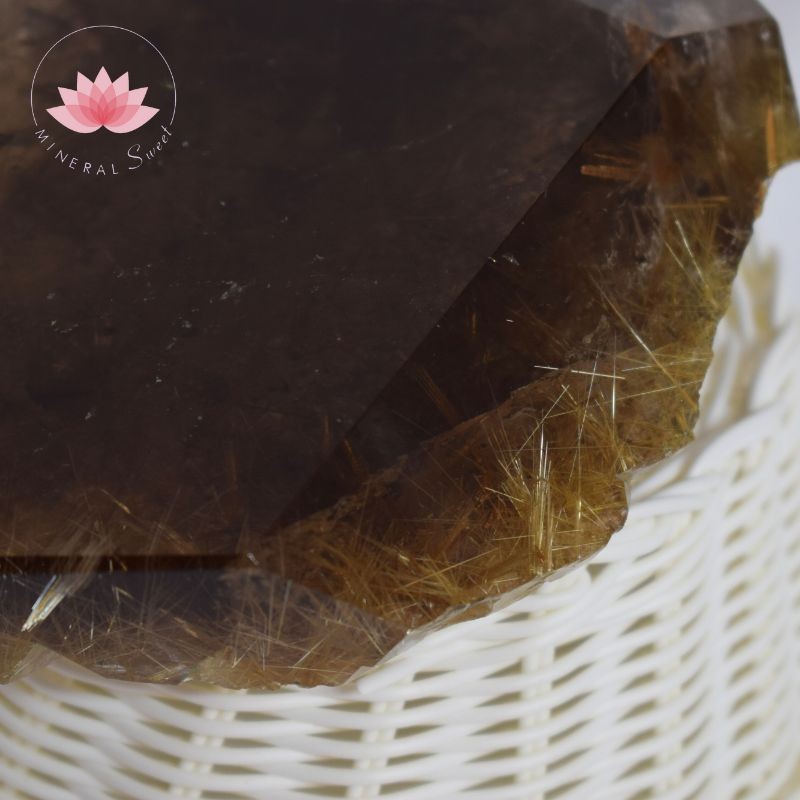 Nous pouvons l'attribuer au quartz rutile jaune or, car rutiler veut dire briller de mille feux.