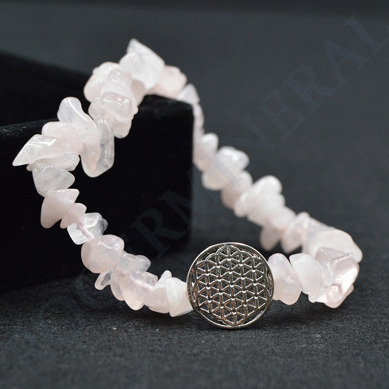 Bracelet de Quartz Rose, petites perles "chips" ou autrement appelées "baroques" agrémenté d'une perle Fleur de Vie en métal blanc