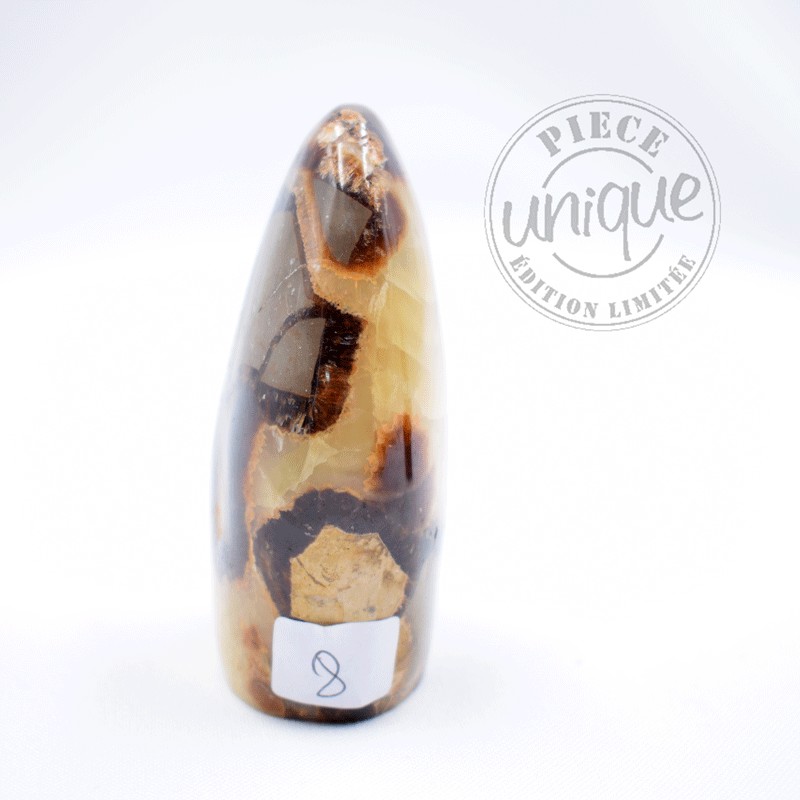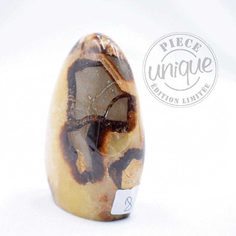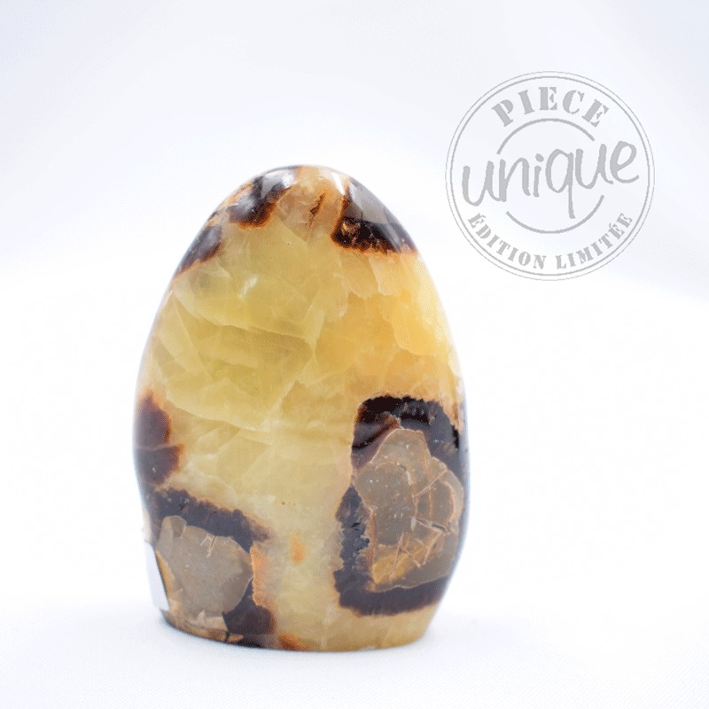 La Septaria est une roche sédimentaire appelée Marne qui est un mélange de calcaire et d'argile de composition chimique (CaCO3) , et de calcite jaune, de composition chimique: CaCO3