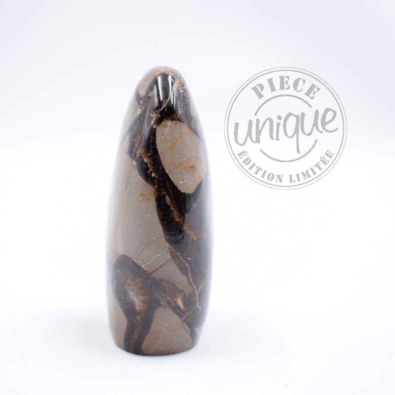 La Septaria est une roche sédimentaire appelée Marne qui est un mélange de calcaire et d'argile de composition chimique (CaCO3) , et de calcite jaune, de composition chimique: CaCO3
