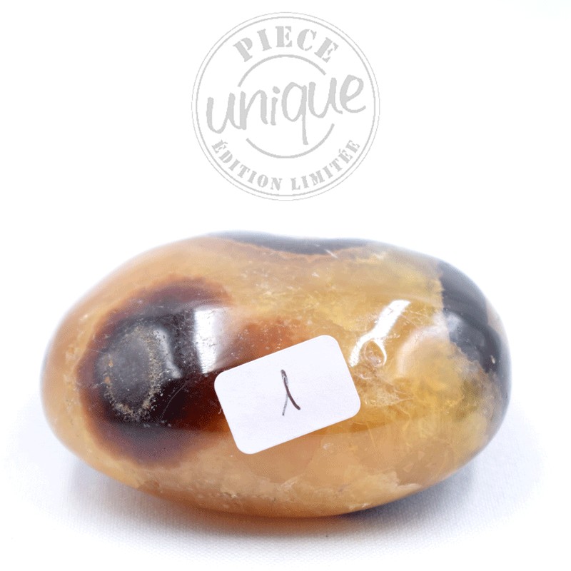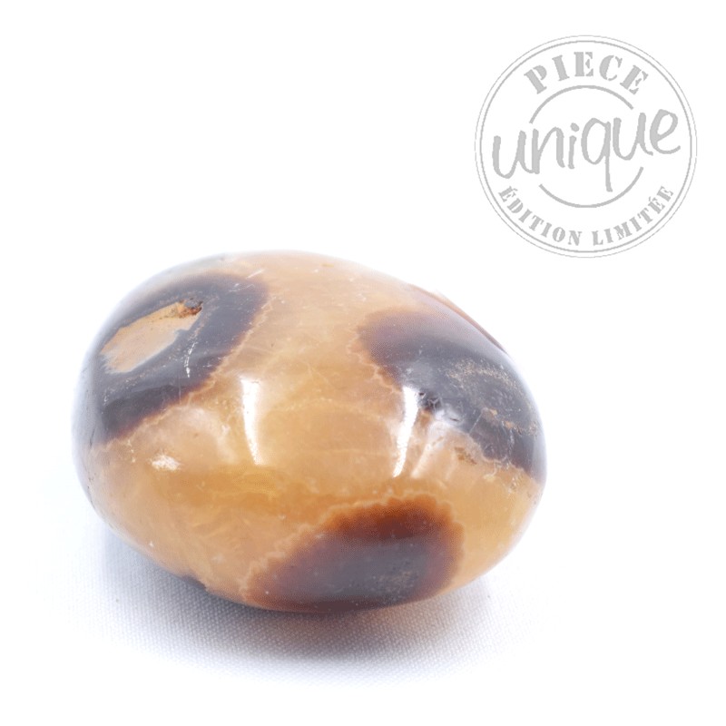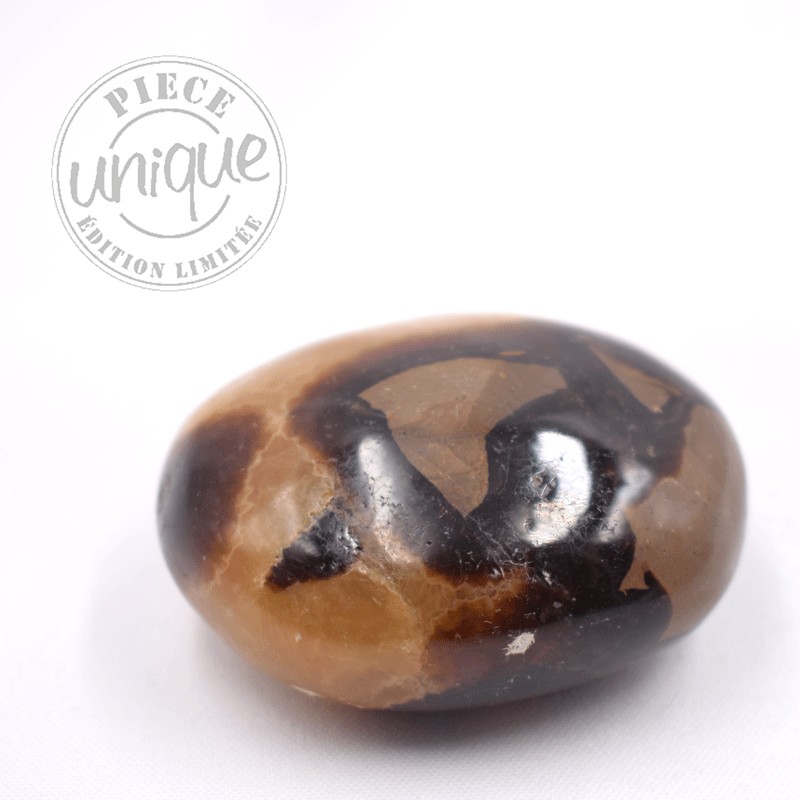 La Septaria est une roche sédimentaire appelée Marne qui est un mélange de calcaire et d'argile de composition chimique (CaCO3) , et de calcite jaune, de composition chimique: CaCO3