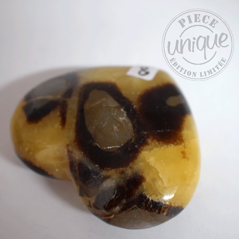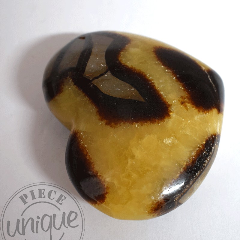La Septaria est une roche sédimentaire appelée Marne qui est un mélange de calcaire et d'argile de composition chimique (CaCO3) , et de calcite jaune, de composition chimique: CaCO3