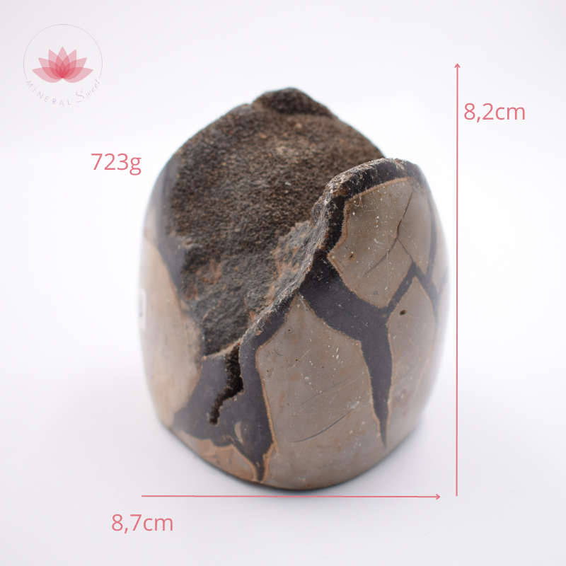 La Septaria est une roche sédimentaire appelée Marne qui est un mélange de calcaire et d'argile de composition chimique (CaCO3) , et de calcite jaune, de composition chimique: CaCO3