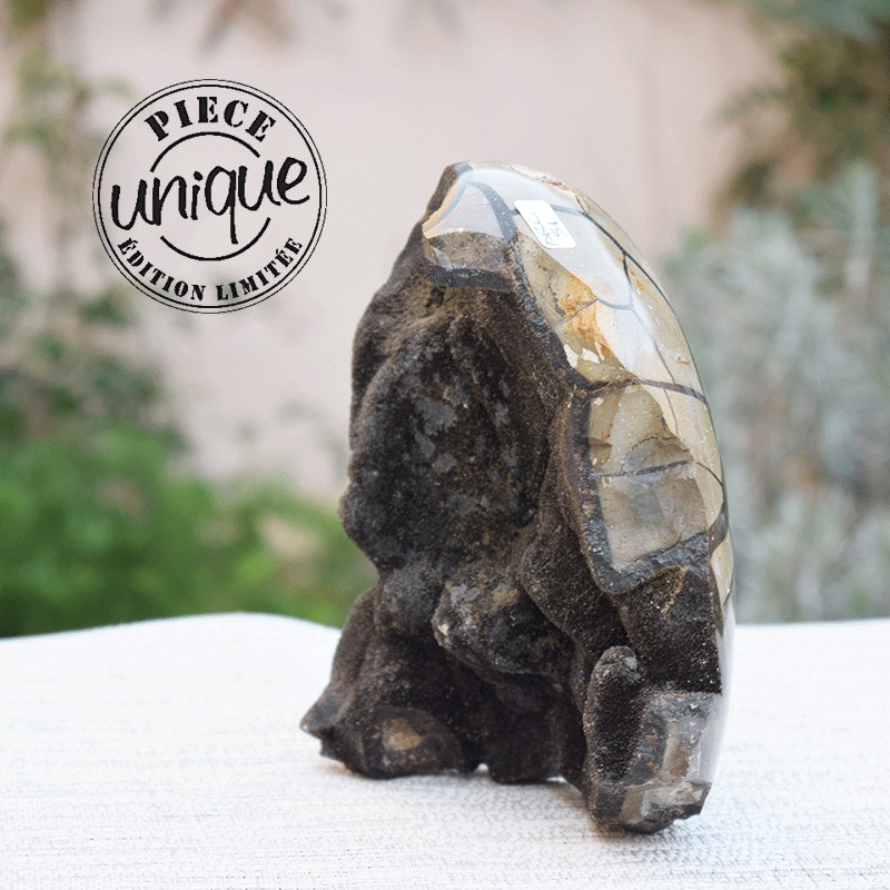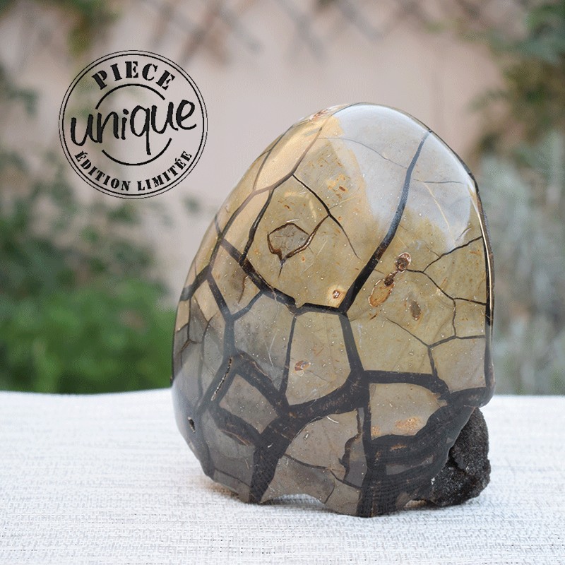 La Septaria est une roche sédimentaire appelée Marne qui est un mélange de calcaire et d'argile de composition chimique (CaCO3) , et de calcite jaune, de composition chimique: CaCO3