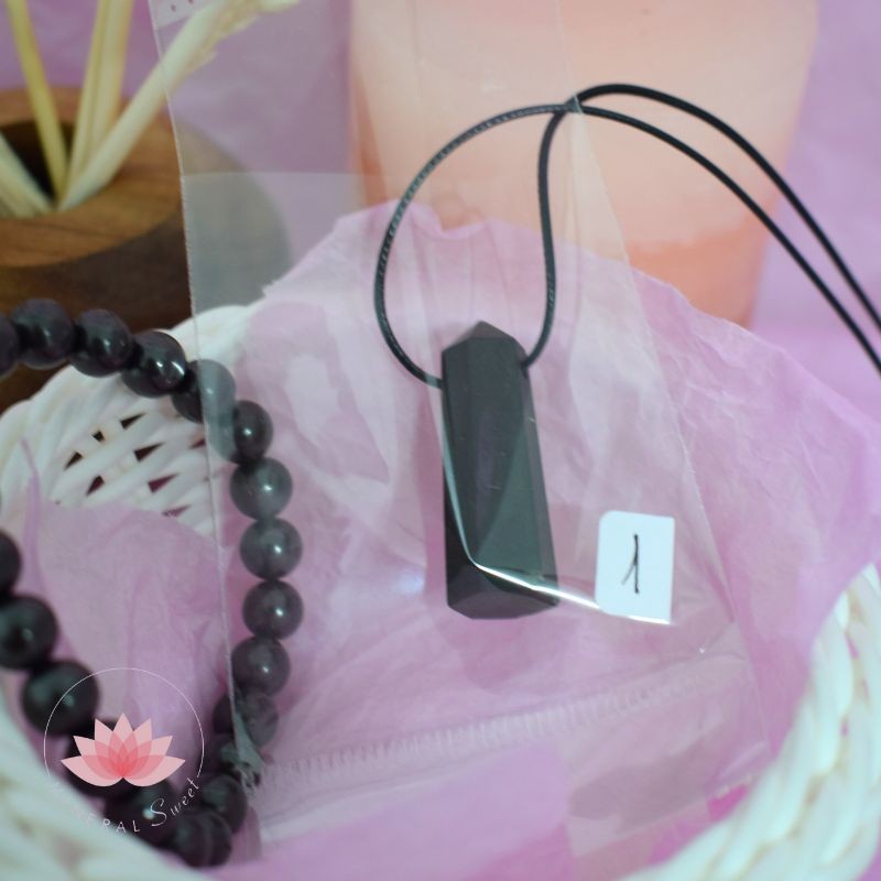 Pendentif en Shungite 6 faces en pointe, avec son cordon noir.