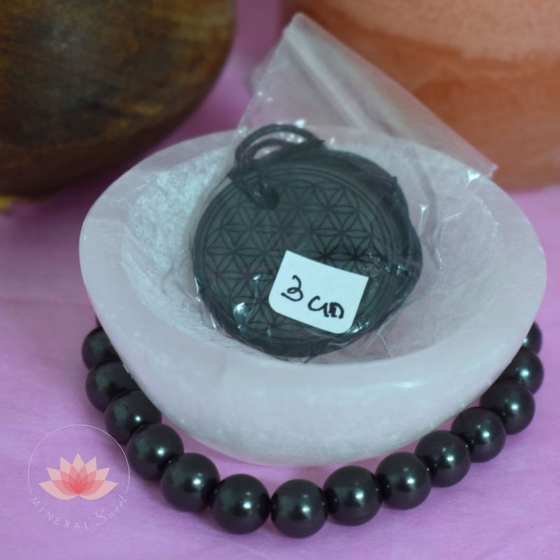 Pendentif Shungite gravée d'une fleur de vie.