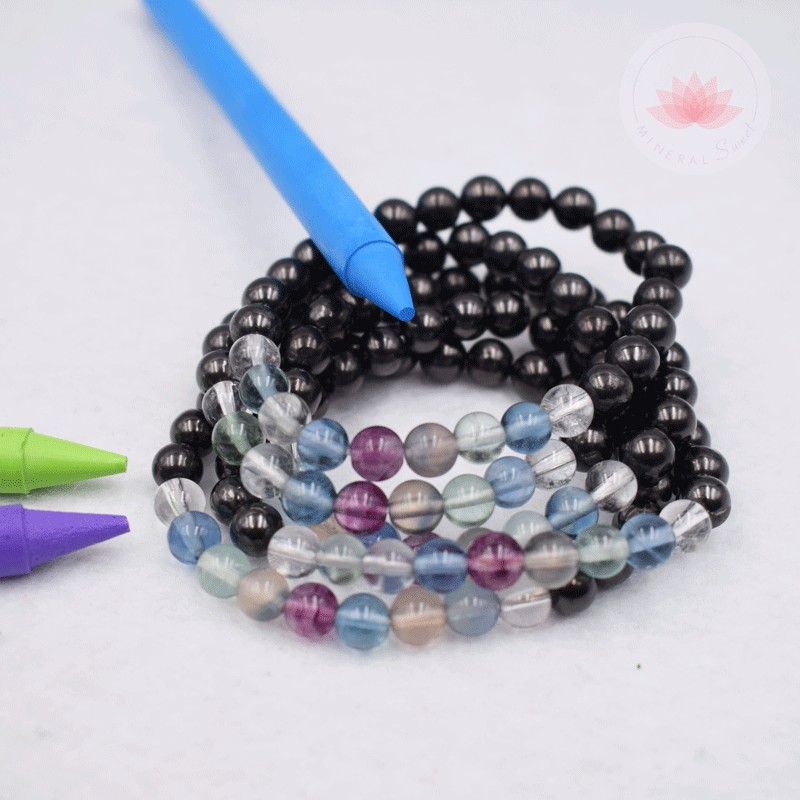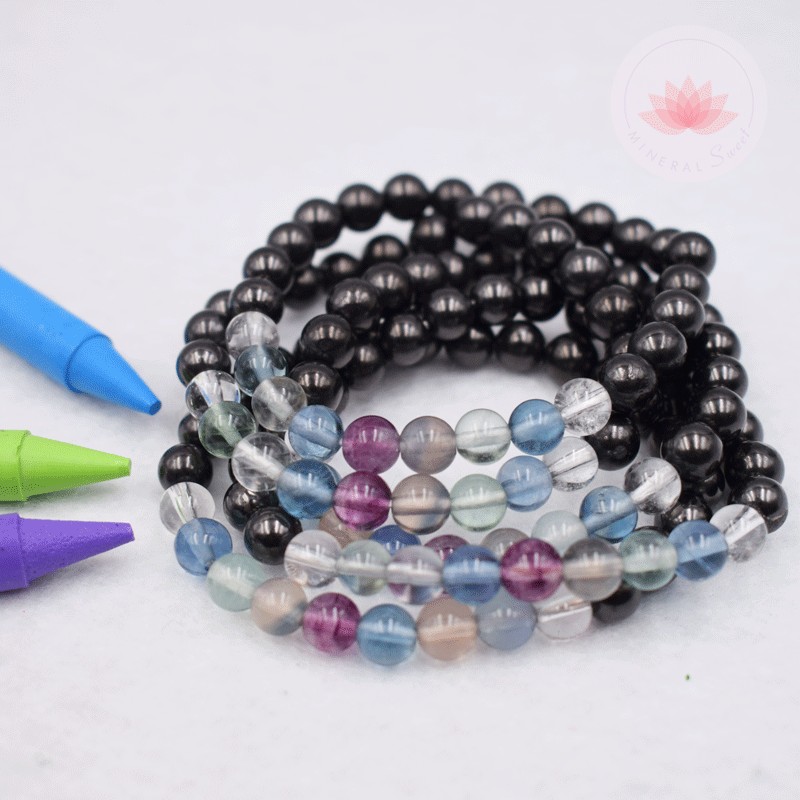 Ce bracelet est composé de 2 pierres : la shungite et la fluorite multicolore.