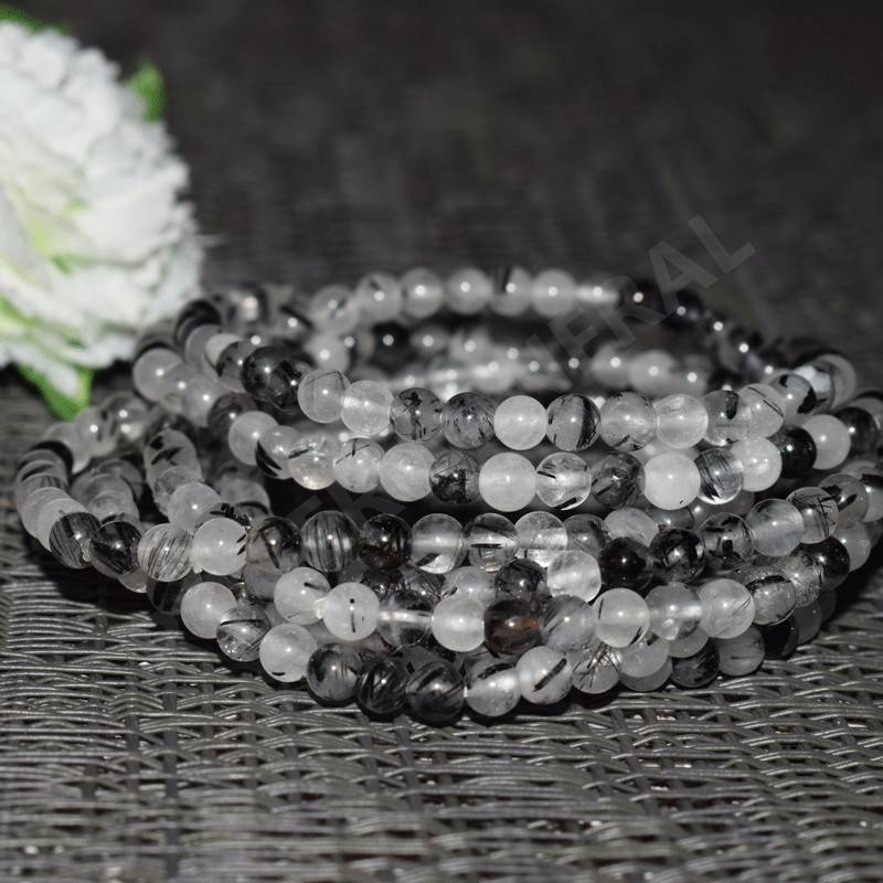 Bracelet en quartz avec inclusions de tourmaline noire, perles rondes de 4mm.